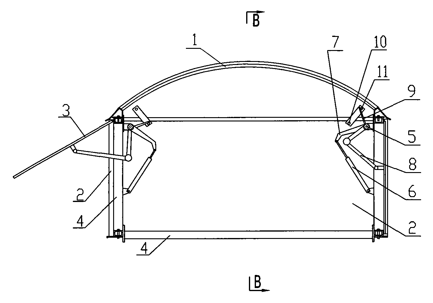 图1所示的采光通风天窗为一个由透光的顶面1和与顶面1连为一体的四个透光的立面2围成的房体,顶面1和立面2连接在骨架4上,顶面1为弧形,顶面1和立面2由阳光板制成.,立面2上设有活动的窗扇3。如图2、图3所示,在骨架4上连接有能转动的传动轴5和铰接有推杆式电机6,传动轴5上固接有拐臂7、连杆8和限位臂9,拐臂7的另一端与推杆式电机6铰接,连杆8的另一端与窗扇3铰接,限位臂9的两侧设有固接在骨架4上的上限位器10和下限位器11,推杆式电机6由控制电路控制,控制电路为现有技术,推杆式电机6为现有商品,在此都不再赘述。附图中所示的窗扇3只设在侧立面上,当然也可设在端立面上,更可以在四个立面上均设。The lighting and ventilation skylight shown in Figure 1 is a room surrounded by a light-transmitting top surface 1 and four light-transmitting facades 2 connected with the top surface 1. The top surface 1 and the facades 2 are connected on the skeleton 4, the top surface 1 is arc-shaped, the top surface 1 and the facade 2 are made of solar panels, and the facade 2 is provided with movable window sashes 3. As shown in Fig. 2 and Fig. 3, a rotatable transmission shaft 5 and a push rod motor 6 are connected on the skeleton 4, and a crank arm 7, a connecting rod 8 and a limit arm 9 are fixedly connected to the transmission shaft 5, The other end of the crank arm 7 is hinged with the push rod motor 6, the other end of the connecting rod 8 is hinged with the window sash 3, and the upper limiter 10 and the lower limiter 11 fixedly connected to the frame 4 are provided on both sides of the limiter arm 9 , the push rod type motor 6 is controlled by a control circuit, the control circuit is a prior art, and the push rod type motor 6 is an existing commodity, and no further details are given here. The sash 3 shown in the accompanying drawings is only arranged on the side elevation, certainly also can be located on the end elevation, more can be all established on four elevations.