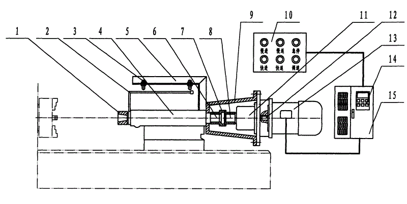 实施例:如图1示,一种无级调速自动进退车床尾座,包括莫氏座1、行程开关固定架2、行程开关3、尾座4、可调行程开关架5、尾座螺杆转轴6、联轴器7、减速机输出轴8、对接盘9、电器控制开关10、减速机11、电机轴12、电机13、变频器14、配电箱15,其设有尾座直联结构,包括尾座4与对接盘9连接,减速机11与电机13直联,尾座螺杆转轴6与联轴器7、减速机输出轴8相联,通过减速机11、电机轴12与减速机输入轴相联,电机13旋转带动减速机11、减速机输出轴8旋转,通过联轴器7连接尾座螺杆转轴6旋转推动莫氏座1进和退达到自动进和退;其设有尾座电器变频控制结构,包括电器控制开关10,电器控制开关10上设慢进、慢退、快进、快退功能键及可选择慢进的模拟量调速开关,通过变频器14调整进或退速度,并设急停开关;可调行程开关架5上设具有限位保护功能的行程开关3。Embodiment: As shown in Figure 1, a tailstock of a stepless speed regulation automatic advance and retreat lathe includes a Morse seat 1, a travel