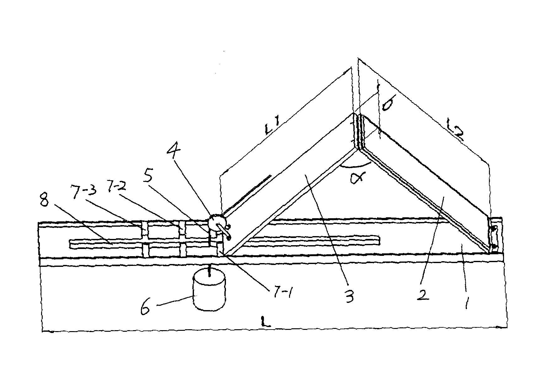 本实施例中,膝关节长轴牵引器的结构如图1所示,包括底板1、大腿垫板2、小腿垫板3、定滑轮4和砝码6。大腿垫板2的长度L2=31cm、宽度b=21cm,小腿垫板3的长度L1=49cm、宽度b=21cm,所述底板1上开设有条形过绳孔8,沿条形过绳孔长轴方向,底板1上相隔一定间距安装有三组定位构件(各组定位构件之间的间距应满足下述大腿垫板2与小腿垫板3之间的夹角要求),每组定位构件由两条矩形柱状体组成,两条矩形柱状体对称安装在条形过绳孔8的两侧。大腿垫板2的一端与底板1铰连,其另一端与小腿垫板3铰连,小腿垫板3的自由端由三组定位构件中的一组定位构件定位,小腿垫板3的自由端由第一组定位构件7—1定位时,大腿垫板2与小腿垫板3之间的夹角α为90°,小腿垫板3的自由端由第二组定位构件7—2定位时,大腿垫板2与小腿垫板3之间的夹角α为135°,小腿垫板3的自由端由第三组定位构件7—3定位时,大腿垫板2与小腿垫板3之间的夹角α为165°。定滑轮4为一个,安装在小腿垫板3的自由端,缠绕在定滑轮上的拉绳5一端用于连接牵引带,其另一端穿过底板上开设的条形过绳孔8与砝码6连接。In this embodiment, the structure of the long-axis retractor for the knee joint is shown in FIG. 1 , including a bottom plate 1 , a