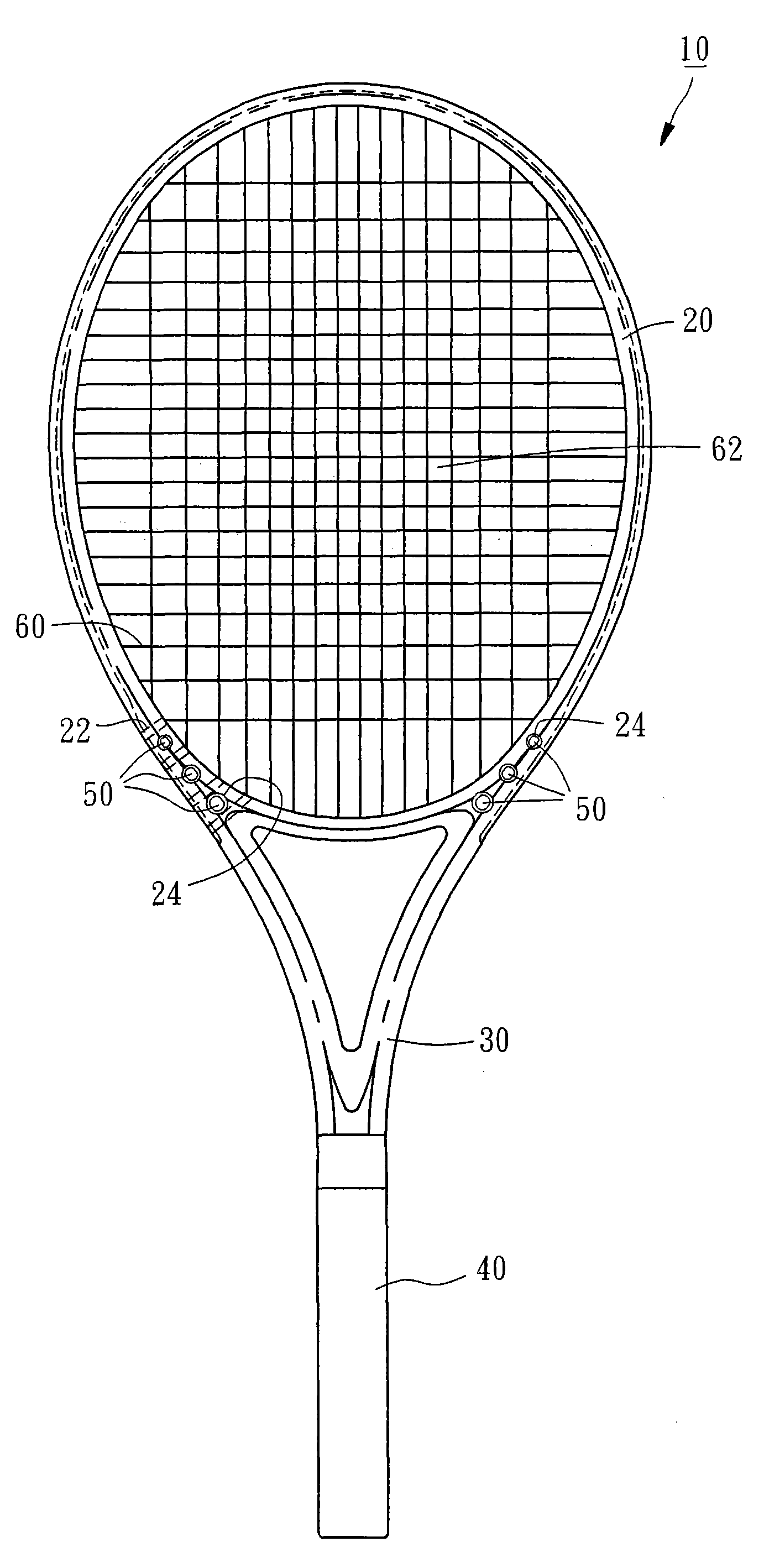 头框20的周缘具有多个穿线孔22,用以供一网线60穿设而形成一击球的拍面62;请再配合图2至图3,头框20的左、右两侧于靠近连接部30的位置分别具有三个穿孔24,该等穿孔24在本实施例中贯穿头框20的顶、底两侧面,并与该等穿线孔22相互交错排列。The peripheral edge of the