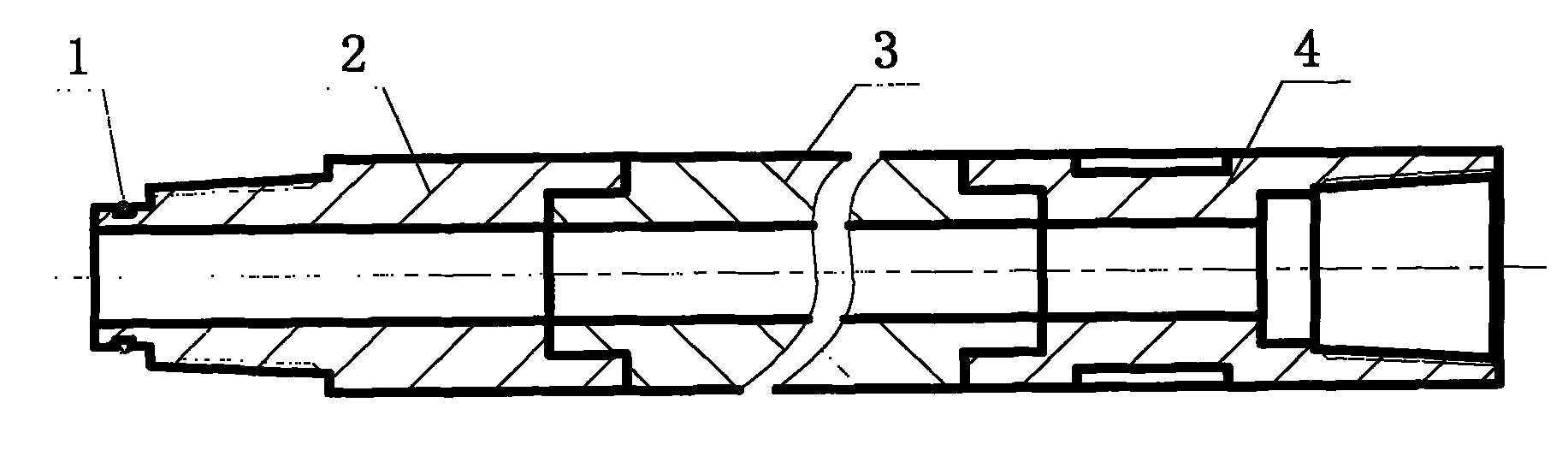Referring to Fig. 1, this water under high pressure sealing drilling rod external diameter is 50mm, and length is 750mm, and the drilling rod main body is welded by male joint 2, intervalve 3 and female joint 4, and 2-4 is the male joint soldering opening.4-1 is the female joint welding section.The centre of female joint 4 is hexahedron section 4-2.The d-axis hole section 4-3 length of the d-axis section 2-1 of male joint and female joint is 12mm, and they are connected with the female joint d-axis hole section of next drilling rod and the d-axis section of a last fillet of tool joint pins respectively, and connecting back two axial plane separations is 0.5mm.Be arranged at ring-shaped groove 2-2 on the section 4-3 of d-axis hole, width is 2.5mm, and the degree of depth is 1.2mm.Ring-shaped groove 2-2 puts into O RunddichtringO 1 before drilling rod connects, thereby drilling rod connects back male joint d-axis section axial plane, female joint d-axis hole section axial plane appropriateness extruding O RunddichtringO 1 is realized radial seal.The tapering of the outer cone thread 2-3 of male joint 2 and the inside tapered thread 4-4 of female joint 4 is 3.5 °~4.5 °, screw thread be length be 38mm 5 teeth/time taper pipe thread made in Great Britain.The inside tapered thread of the outer cone thread 2-3 of male joint 2 and the female joint of next drilling rod screws and is connected, and the inside tapered thread 4-4 of female joint 4 screws with the outer cone thread of the male joint of a last drilling rod and is connected.