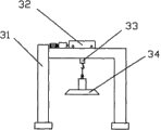 本实施例所述的封头自动堆垛装置3如图2所示,包括具有横梁的型钢底盘31,型钢底盘31的横梁上设置有减速机、控制减速机工作的驱动电机和行走小车32,所述的减速机和驱动电机配合工作驱使行走小车32在横梁上移动,所述的行走小车32通过电动葫芦33在横梁的下方连接有堆垛封头的吸盘34。行走小车32通过吸盘34将封头吸住上升后行走,到指定位置后放下堆垛。