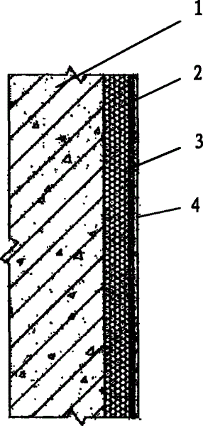 本实施例的前段制作工序(即主墙体1与保温层2的制作工序)与本实用新型第一实施例相同,在面层砂浆硬化后,铺抹饰面砂浆或涂料,饰面砂浆硬化或者涂料干燥后,即在该面层砂浆层3上结合了该饰面层4,一个表面有饰面砂浆或涂料层的建筑墙体保温结构即告完成。 The front section manufacturing process of this embodiment (that is, the manufacturing process of the