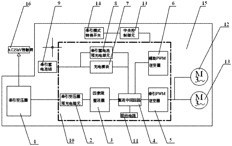 Among the figure: 1, traction transformer, 2, the traction transformer precharge unit, 3, four-quadrant rectifier, 4, direct current intermediate circuit, 5, traction PWM inverter, 6, auxiliary PWM inverter, 7, charging module, 8, the traction accumulator precharge unit, 9, the traction accumulator group, 10, integrated traction convertor, 11, absorbing resistor, 12, phase asynchronous traction electric machine, 13, Central Processing Unit (CPU), 14, traction mode change-over swith, 15, locomotive, 16, the 25kV contact system.