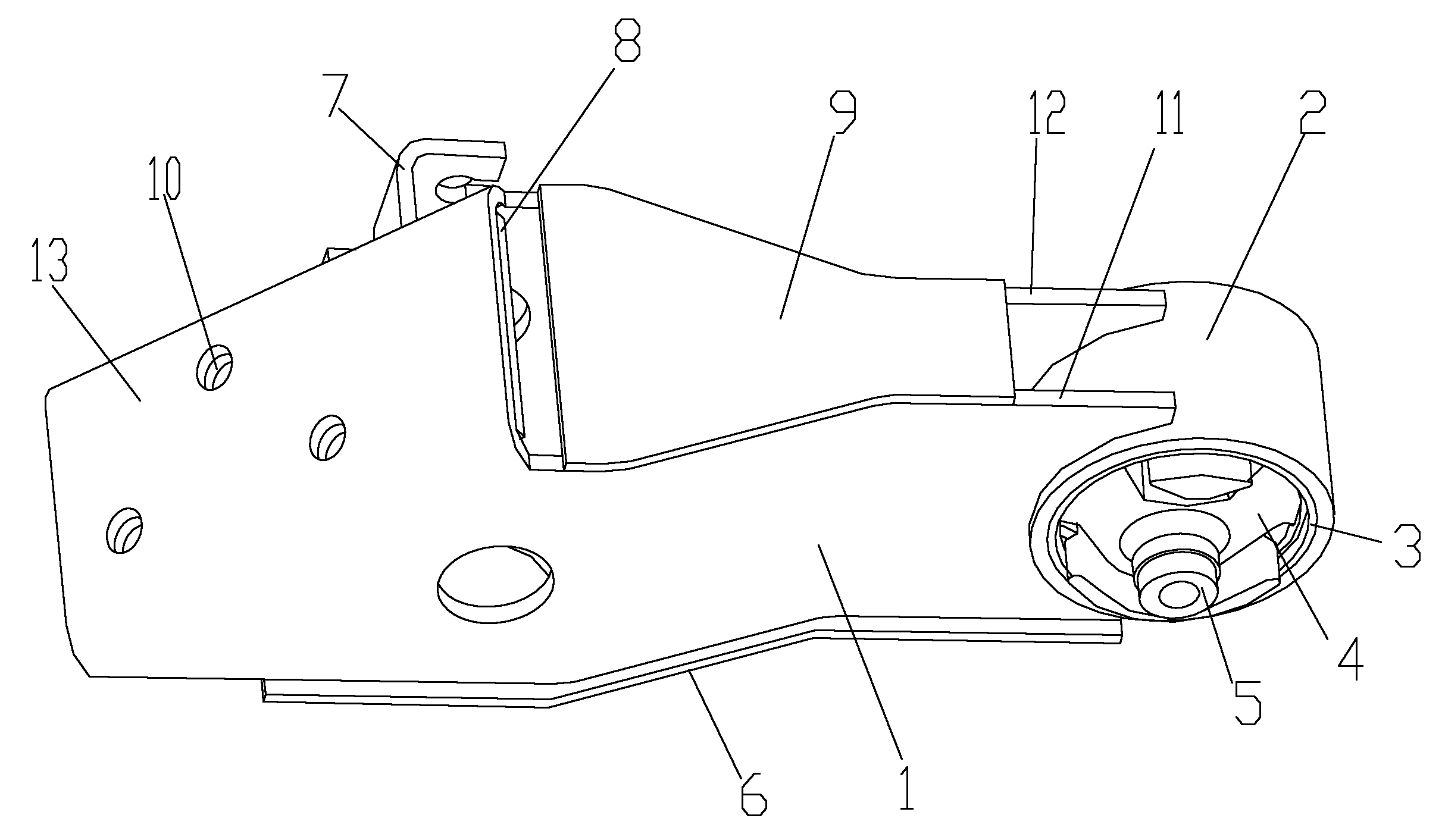 本实用新型的有益效果:本实用新型的汽车发动机左悬置减震支架总成,采用左悬架结构和减震结构结合的整体结构,安装于车架上后协同受力,以较小的体积实现较好的连接强度和减震效果,既能够满足承载发动机要求,又避免了铸造件的高能耗和高成本,同时也节省了空间,降低整车质量,结构紧凑,容易安装和布置,提高工作效率,提高整车的安全性和经济性。Beneficial effects of the utility model: the left suspension shock absorber bracket assembly of the automobile engine of the utility model adopts the integral structure combining the left suspension structure and the shock absorber structure, and after being installed on the vehicle frame, the force is coordinated, and the The volume achieves better connection strength and shock absorption effect, which can not only meet the requirements of carrying the engine, but also avoid the high energy consumption and high cost of castings, and also save space, reduce the weight of the whole vehicle, compact structure, easy to install and arrange, Improve work efficiency, improve vehicle safety and economy.