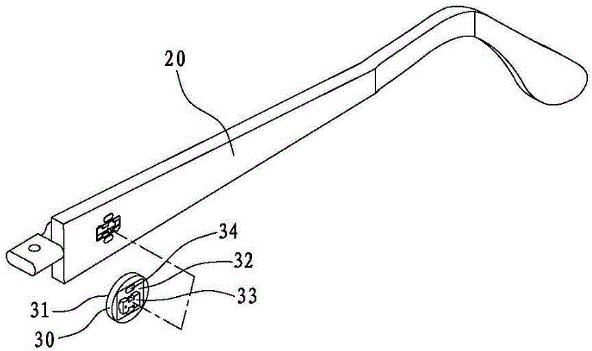 Described leg of spectacles 20 is provided with the groove 21 that matches with this gadget 30 faying face fixture blocks 33, the position of corresponding aforementioned fixture block 33 magnet 34 in the both sides of this groove 21 is provided with the opposite magnet of magnetic pole 22, utilize the suction-operated of magnet, can fixture block 33 be snapped in the groove automatic contraposition; Further, this groove 21 is to the side extension 23 of postponing, the end face symmetry of this extension 23 be provided with two catch 24, utilize this extension 23 and two catch 24 to form a draw-in groove.