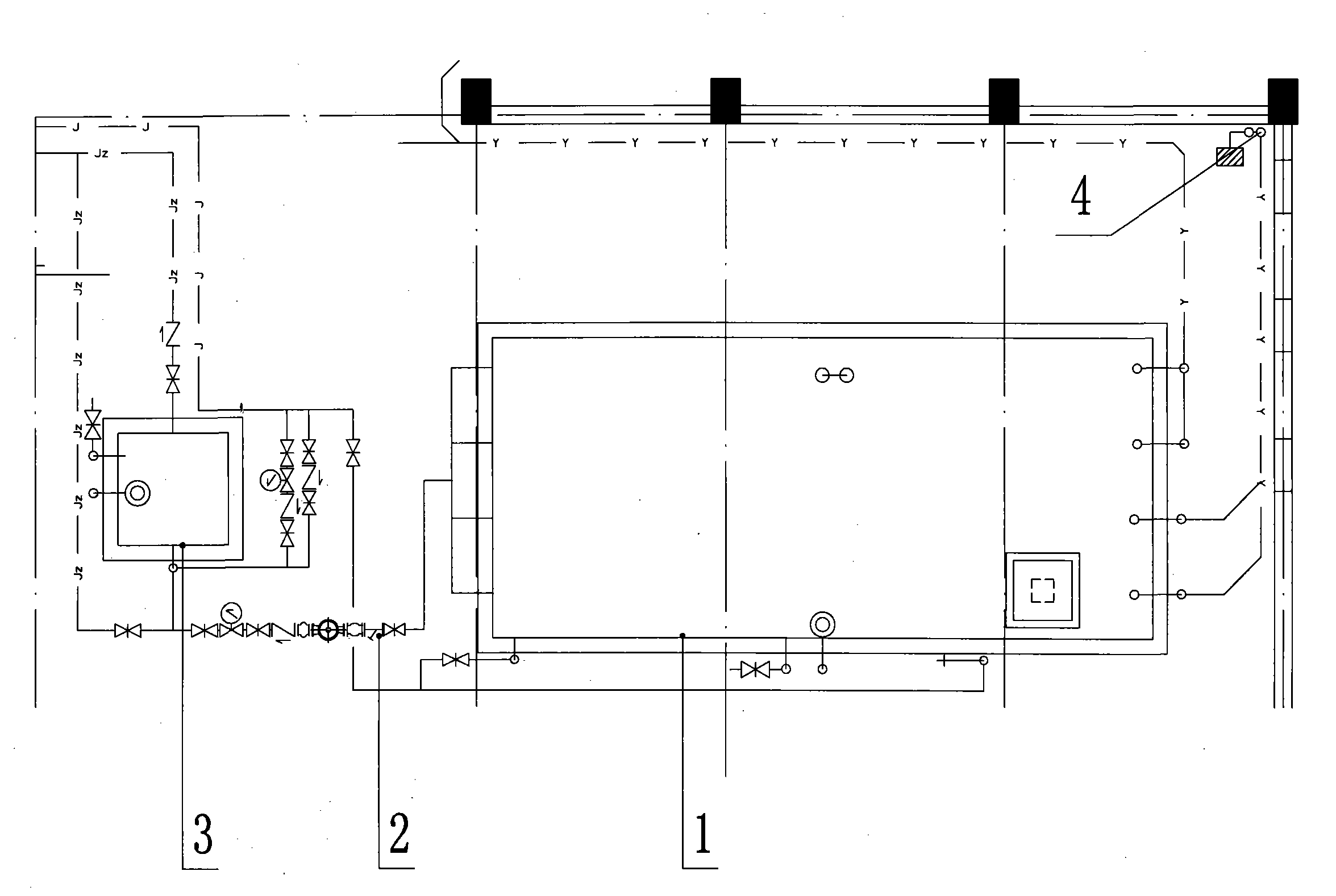 本实用新型的原理图如图1所示,本实用新型的雨水收集利用系统,包括有雨水收集池1、自动清洗水过滤器2、清水池3、雨水弃流装置4,其中用于收集屋面雨水的雨水弃流装置4设在裙楼屋面上,雨水弃流装置4的出水口与雨水收集池1的进水口相通,雨水收集池1的出水口与自动清洗水过滤器2的进水口相通,自动清洗水过滤器2的出水口与清水池3的进水口相通。 The principle diagram of the utility model is shown in Figure 1. The rainwater collection and utilization system of the present utility model includes a rainwater collection pool 1, an automatic cleaning water filter 2, a clear water pool 3, and a rainwater discarding device 4, which are used to collect roof The rainwater discarding flow device 4 of rainwater is arranged on the podium roof, and the outlet of the rainwater discarding device 4 communicates with the water inlet of the rainwater collection tank 1, and the water outlet of the rainwater collection tank 1 communicates with the water inlet of the automatic cleaning water filter 2 , the water outlet of the automatic cleaning water filter 2 communicates with the water inlet of the clear water pool 3. the