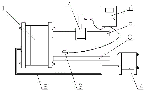 如图1所示,一种在线智能控制采暖系统,包括蒸汽管道5,蒸汽管道5与热交换器1连接,热交换器1与暖气片4通过热水管道8连接,暖气片4与热交换器1之间设置有回水管2,所述蒸汽管道5上设置有电动调节阀7;所述热水管道8上设置有温度传感器3;温度传感器3与电动调节阀7通过智能控制器6连接。 As shown in Figure 1, an online intelligent control heating system includes a steam pipe 5, the steam pipe 5 is connected to the heat exchanger 1, the heat exchanger 1 is connected to the radiator 4 through a hot water pipe 8, and the radiator 4 is connected to the heat exchange A return pipe 2 is arranged between the devices 1, and an electric regulating valve 7 is arranged on the steam pipe 5; a temperature sensor 3 is arranged on the hot water pipe 8; the temperature sensor 3 and the electric regulating valve 7 are connected through an intelligent controller 6 .
