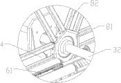 再者,如图3所示,上述翻转机构3包括翻转电机31、翻转轴32,翻板机组8等间距固定安装于翻转轴32上,翻转电机31驱动翻转轴32旋转,翻转电机31同时带动二组或二组以上的翻板机组8在输入动力辊台4、输出动力辊台6之间360度旋转,且旋转间距为等弧度旋转。根据实际应用,翻转轴32上有4组翻板机组8,4组翻板机组8等距离分布于翻转轴32上。该翻板机组8上包括固定轮81、设置于固定轮81上的二个或二个以上的翻转臂82,固定轮81固定安装于翻转轴32上,翻转臂82等弧度分布于固定轮81上,翻转电机31对应翻转臂82分布的弧度控制翻转轴32运行。由于本实用新型固定轮81上有六个翻转臂82,翻转臂82之间等弧度60度且分布于固定轮81上,翻转电机31对应翻转臂82的60度的弧度控制翻转轴32运行,且控制翻转轴32运行的翻转电机31为带有刹车系统的减速电机。