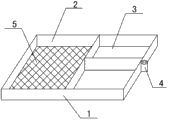 As shown in Figure 1; The described a kind of nursing pallet of this utility model; Comprise square disk body 1, first material storage room 2 about disk body 1 is divided into through dividing plate and second material storage room 3, a lateral edges place of disk body 1 is provided with sterile pot 4; Sterile pot 4 is built-in with the syringe needle slot, and wherein first material storage room, 2 inner bottom parts are provided with filter plate 5.