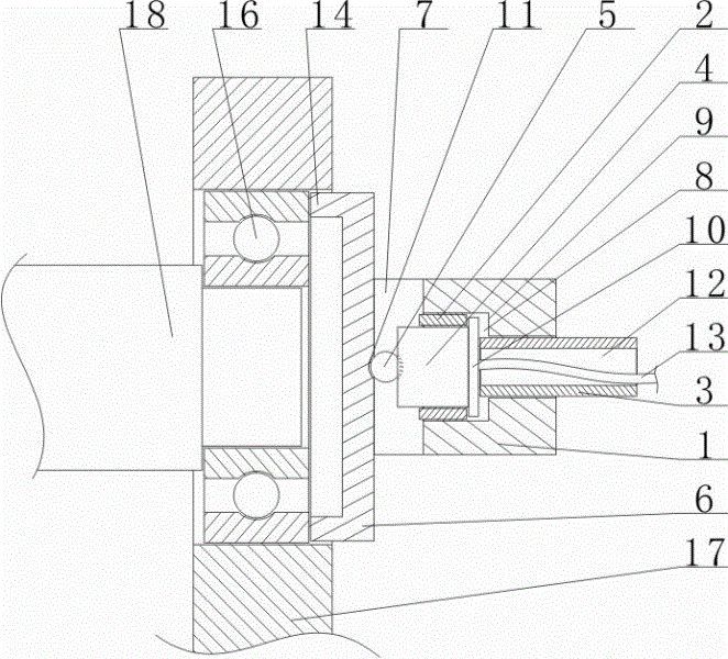 图中:1、加载座;2、套筒;3、加载螺母;4、传感器;5、滚珠;6、压盖;7、凹槽;8、通孔;9、过渡台阶面;10、限位块;11、定位凹坑;12、穿孔;13、数据线;14、加载边;15、限位环边;16、轴承;17、轴承座;18、轴。
