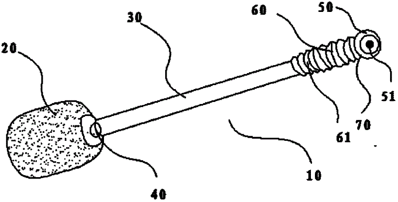 10、马桶刷 20、刷头 30、刷杆 40、单向阀门 50、盖子 51、按钮 60、护套 61、突条 70、密封圈10.