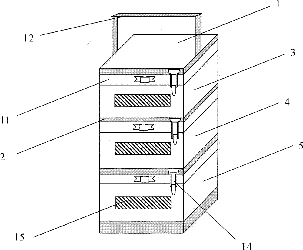 其中,1、箱体,2、隔板,3、上放置腔,4、中放置腔,5、下放置腔,6、上放置盒,7、中放置盒,8、下放置盒,9、编号板,10标本放置孔,11、化验单放置盒,12 提手,13转轴,14、锁紧装置,15提示标签袋。 Among them, 1. Box, 2. Partition, 3. Upper cavity, 4. Middle cavity, 5. Lower cavity, 6. Upper box, 7. Middle box, 8. Lower box, 9. Numbering plate, 10 specimen placement holes, 11, test sheet placement box, 12 handle, 13 rotating shaft, 14, locking device, 15 reminder label bag. the