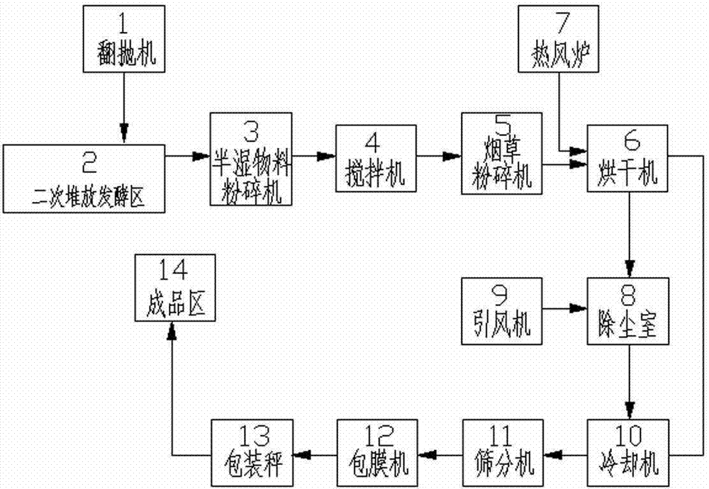 Among the figure: the 1-turnover throwing machine, the 2-secondary is stacked fermentation zone, 3-half wet stock kibbler, 4-stirrer, 5-tobacco kibbler, 6-dryer, 7-hotblast stove, 8-dust settling chamber, 9-induced draft fan, 10-cooler, 11-sieve apparatus, 12-coating machine, 13-packing scale, 14-finished product district.