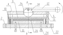 图中:2、底板,4、顶板,6、立板,8、压板,10、垫板,12、操作手柄,14、偏心轮,16、螺钉,18、弹簧,20、羊毛毡,22、安装孔,24、调节螺钉,26、支架。