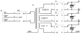 Shown in Fig. 2 (a), Fig. 2 (b), described dc power supply partial circuit 1 be by three-phase electricity wherein two do power supply mutually, insert J1; Connect to transformer S1 through electromagnetic interface filter FI1; Obtain alternating voltage, obtaining three DC power supplys through three rectifier bridge V1, V2, V3, DC power supply access power module U1, U2, U3, U4 obtain the various DC power supplys of needs in the work; Wherein also comprise the amplifier module U5A, U5B, U6A, the U6B that are used for rectification, filtering and amplification; Capacitor C 1~C19, resistance R 1~R8, inductance L 1.