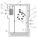 图中各标号说明:1.箱体,2.水路循环管,3.进风口,4.加湿过滤材料,5.水路循环管,6.电动风轮,7.自吸式抽水泵,71.自吸式抽水泵,72.自吸式抽水泵,8.潜水泵,9.散热热交换器,91.散热热交换器外壳,92.散热热交换器翅片,93.散热热交换器通道,10.电子制冷芯片,11.制冷热交换器,111.制冷热交换器翅片,112.制冷热交换器风道,12.出风口,13.储水水箱。
