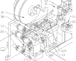 麦拉胶带收放机构3,设置在分度盘2旁边,包括放料盘31、收料盘32、取胶平台33。放料盘31、收料盘32可以由分别通过一连接在机台1上的挑臂34悬空旋转。放料盘31、收料盘32的旋转轴平行设置。放料盘31初始状态时为一缠绕满麦拉胶带的圆盘,其旋转时可将麦拉胶带逐渐释放,麦拉胶带的自由端经取胶平台33上的槽后绕至取胶平台33下方的多个滚轴35、收料滚轴36,最后缠绕至收料盘32上。其中,收料盘32为主动盘,与一电机321连接由电机321驱动其旋转,电机321由控制装置控制运行;放料盘31为从动盘,由收料盘32的转动带动其上的麦拉胶带6缠绕使放料盘跟随旋转。放料盘31、收料盘32均通过快夹安装,更换方便快捷。