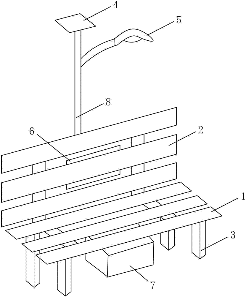 如图1、图2所示的一种带太阳能的靠椅,包括椅面1、椅背2和四个支撑脚3,椅背2上设有太阳能电池板4及灯泡5,具体说是椅背2上设有固定杆8,太阳能电池板4与灯泡5设置在固定杆8上。A kind of armchair with solar energy as shown in Fig. 1, Fig. 2, comprises