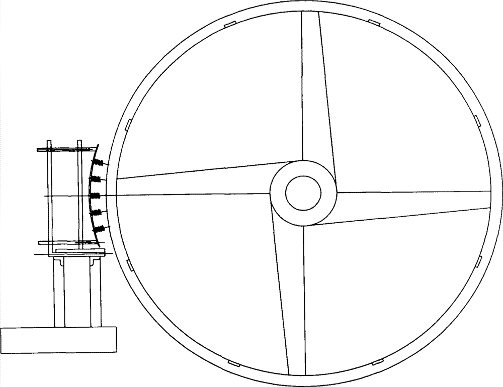 本实用新型的设备结构主要由筛框(1)、筛板(2)、弹性刷(3)、刷板(4)、减速机(5)、电机(6)等部件构成(见说明书附图图1)。其中,筛框由多个滚圈(7)、横梁(8)组成,外形呈圆筒或圆台形状,通过一根轴(9)固定在轴承座(10)上,利用电机、减速机驱动进行旋转,其转速根据物料的填充率、筛分时间、生产能力等参数计算而确定;筛板(见说明书附图图3)形状为圆弧形,采用耐磨钢制作而成,由多组筛齿(11)平行组合一起,筛齿形状接近“V”型,筛缝为长条圆弧状并与滚筛轴向垂直,形状接近倒“V”型,其尺寸从内向外是逐渐增大的,因此物料不易被卡死,筛板是通过螺栓固定在横梁上。弹性刷由弹性钢丝制作而成,有两种结构形式,一种结构为弹簧式结构(见说明书附图图4),其一端为弹簧形状(13),而另一端为直线形状(12),工作时直线端伸进筛缝进行清理;另一种结构为直线式结构。弹性刷的弹性、变形量都需要根据筛分时对物料“捅”、“拨”和“刮”受力作用进行精确计算而确定,多根弹性刷通过螺栓规律地固定在弧形刷板上,基本保证每个筛缝都有数根弹性刷,刷板能够水平移动,当弹性刷磨损严重时,可水平调整刷板距离使得弹性刷重复利用。弹性刷的工作方式有固定式和旋转式两种。 The equipment structure of the utility model is mainly composed of sieve frame (1), sieve plate (2), elastic brush (3), brush plate (4), reducer (5), motor (6) and other components (see the accompanying drawings figure 1). Among them, the screen frame is composed of a plurality of rolling rings (7) and beams (8), and its shape is in the shape of a cylinder or a round table. Rotation, the speed is determined according to the calculation of the material filling rate, screening time, production capacity and other parameters; The teeth (11) are combined in parallel, the shape of the teeth is close to "V" shape, the sieve slot is long and arc-shaped and perpendicular to the axis of the rolling screen, the shape is close to an inverted "V" shape, and its size gradually increases from inside to outside Therefore, the material is not easy to be stuck, and the sieve plate is fixed on the beam by bolts. Elastic brush is made by elastic steel wire, has two kinds of structural forms, and a kind of structure is spring type structure (see accompanying drawing Fig. 4 of specification sheet), and its one end is spring shape (13), and the other end is linear shape (12), When working, the straight end extends into the sieve gap for cleaning; the other structure is a linear structure. The elasticity and deformation of the elastic brushes need to be determined according to the precise calculation of the force of the material "poke", "dial" and "scrape" during screening. Multiple elastic brushes are regularly fixed on the arc-shaped brush plate by bolts , It is basically guaranteed that there are several elastic brushes in each sieve gap, and the brush plate can move horizontally. When the elastic brush wears seriously, the distance between the brush plates can be adjusted horizontally to make the elastic brush reusable. There are two types of elastic brushes: fixed and rotary. the