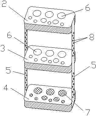 其中:1-顶盖、2-顶部支板、3-中部支板、4-固定底座、5-支撑杆、6-通孔、7-凹槽、8-孔眼。 Among them: 1-top cover, 2-top support plate, 3-middle support plate, 4-fixed base, 5-support rod, 6-through hole, 7-groove, 8-hole.