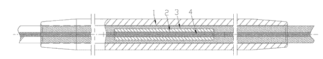 As shown in Figure 1, splicing sleeve is made of aluminum pipe 1 and steel pipe 2, and aluminum pipe 1 adopts 6063 aluminium alloys, and aluminium-alloy pipe intensity is not less than 140MPa, and elongation is not less than 20%; Steel pipe adopts the Q235A steel, yield strength 235Mpa, and phosphorus content is not more than 0.15%, and finished product hardness is not more than HB137, and steel pipe 2 adopts hot galvanizings anticorrosion, should return remaining zinc after zinc-plated.Aluminum pipe 1 length is 1260mm, and external diameter is 76mm, and internal diameter is 43mm, and the taper length at aluminum pipe 1 two ends is 100mm, and the taper angle at aluminum pipe 1 two ends is 4 °; Steel pipe 2 length are 280mm, and external diameter is 28mm, and internal diameter is 12.1mm, and the mouth of pipe of aluminum pipe 1 and steel pipe 2 all is provided with circular arc chamfering.Aluminum pipe 1 is enclosed within on the steel pipe 2, aluminium alloy stranded conductor 3 and steel core twisted wire 4 dock with aluminum pipe and steel pipe hydraulic pressure respectively form aluminum pipe 1 and steel pipe 2 coaxial.
