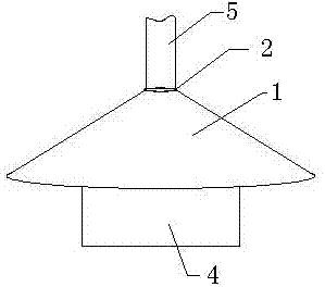 为解决上述技术问题,本实用新型提供一种电力刀闸机构箱防雨罩,包括罩体,其特征在于:所述电力刀闸机构箱防雨罩为圆锥台形状,所述圆锥台的上底面与电力刀闸机构箱上的连杆横截面相配合,所述圆锥台的上底面圆周位置固定设置有橡胶密封圈。 In order to solve the above technical problems, the utility model provides a rainproof cover for the electric knife switch mechanism box, which includes a cover body, and is characterized in that: the rainproof cover for the electric knife switch mechanism box is in the shape of a truncated cone, and the upper part of the truncated cone is The bottom surface matches the cross-section of the connecting rod on the electric knife switch mechanism box, and a rubber sealing ring is fixedly arranged on the circumference position of the upper bottom surface of the conical truncated cone. the