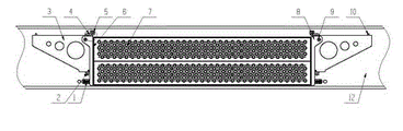 如图1到图5所示,1、插销,2、支撑耳板,3、支撑板,4、L形耳板,5、销轴,6、平台框架,7、踏板,8、突出部,9、聚氨酯垫片,10、固定销,11、销孔板,12、车体。