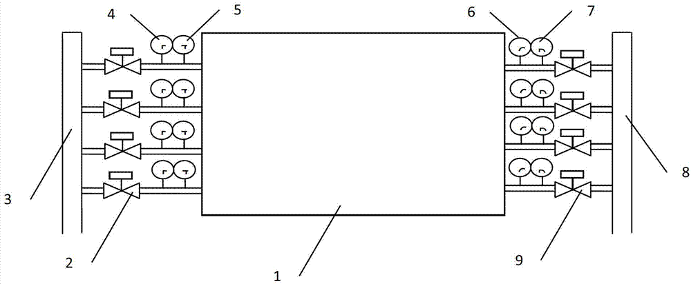 其中:1为换热器;2为入口流量调节阀;3为进水母管;4为压力表;5为温度表;6为流量表;7为电导率表;8为出水母管;9为出口流量调节阀。Among them: 1 is heat exchanger; 2 is inlet flow regulating valve; 3 is inlet jellyfish pipe; 4 is pressure gauge; 5 is temperature gauge; 6 is flow meter; 7 is conductivity meter; 8 is outlet jellyfish pipe; 9 is Outlet flow regulating valve.