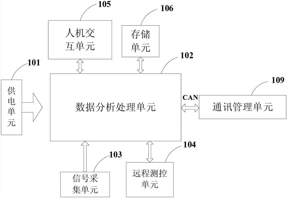 图1为本实用新型具体实施例的低压配电网智能测控装置的结构框图。如图1所示,所述智能测控装置包括供电单元101、数据分析处理单元102、信号采集单元103、远程测控单元104、人机交互单元105、存储单元106和通讯管理单元109,其中,所述数据分析处理单元102分别与信号采集单元103、远程测控单元104、人机交互单元105、存储单元106和通讯管理单元109连接。Fig. 1 is a structural block diagram of an intelligent measurement and control device for a low-voltage distribution network according to a specific embodiment of the present invention. As shown in Figure 1, the intelligent measurement and control device includes a