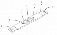 在本实施例中,导流连接体2的形状可为条形、片形或线缆形等,其与电池组可以通过螺栓压接、端子对接或连接器对接等方式连接。优选的,导流连接体2的形状为片形,在该片形导流连接体2与电池组相连的一端开设有一小通孔21,如图1、2。在将该连接装置连接于电池组之间时,取一螺钉等连接件穿过通孔21,将导流连接体2连接于电池组的相应连接端子上,这种结构便于制造和装配,连接的稳定性也较佳。