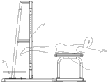 Among the figure: 1 human body support portion, 2 space frameworks, 21 support bars, 22 columns, 3 balancing weights, 4 cross bars, 41 location structures, 42 locating holes, 5 positioning sliding blocks, 6 latex elastic force belts, 7 degree of tightness leg rings.