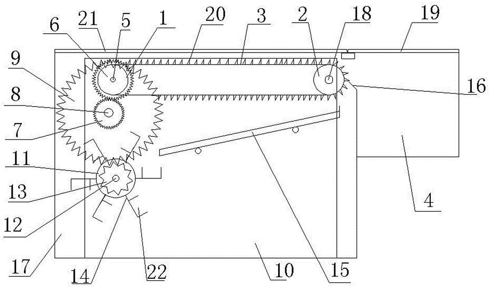如图1所示,一种排水管道防堵系统,包括支承架10,支承架10上设置有污物传送装置和动力装置,污物传送装置包括驱动轮1、从动轮2及套在驱动轮1和从动轮2上的传送带3,传送带3上设置有漏水孔,从动轮2侧方设置有污物储藏室4,污物储藏室4上端设置有刷子16,驱动轮1通过转轴Ⅰ5安装在支承架10上端部,转轴Ⅰ5上设置有从动齿轮Ⅱ6,从动轮2通过转轴Ⅳ18安装在支承架10上;动力装置包括设置在从动齿轮Ⅱ6下方且与从动齿轮Ⅱ6相配合的主动齿轮Ⅱ7, 主动齿轮Ⅱ7通过转轴Ⅱ8安装在支承架10上,转轴Ⅱ8上设置有从动齿轮Ⅰ9,从动齿轮Ⅰ9下方设置有滚轮11,滚轮11通过转轴Ⅲ12安装在支承架10上,转轴Ⅲ12设置有与从动齿轮Ⅰ9相配合的主动齿轮Ⅰ13,滚轮11圆周上均匀设置有六个叶片14,传送带3下方设置有雨水收集槽15,雨水收集槽15出水口向下倾斜,雨水收集槽15出水口位于叶片14侧方;本实用新型传送带上均匀设置有刮齿20,确保杂物随传送带一起移动,叶片14前端均设置有集水池22,集水池22和叶片14共同作用给叶片14转动提供动力。