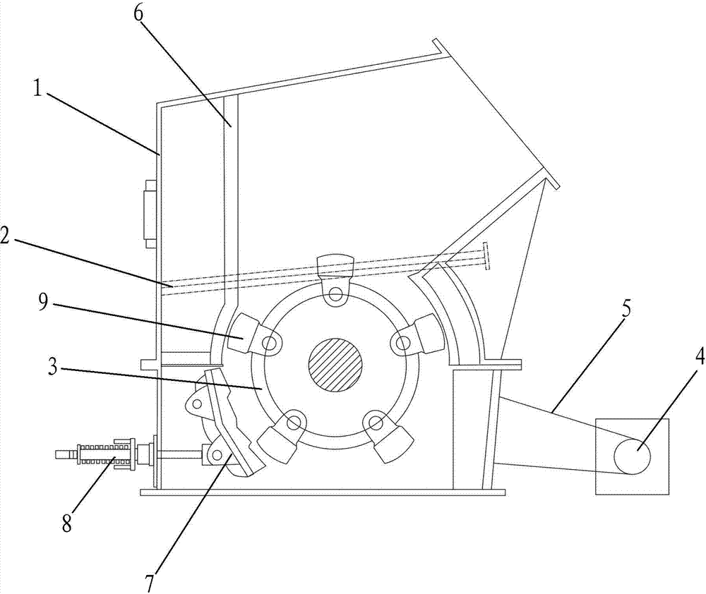 Embodiment: motor 4 is done counterclockwise High Rotation Speed by belt 5 rotor drivens 3, the tup 9 of rotor 3 moves in the gap of intermediate bracket 2, after entering, receives material the high-speed impact of tup 9, material breaks and hits counterpunch board 6 and occurs in small, broken bits, by continuous bump, the material particles diameter drops to equal main plot by mesh during less than the mesh diameter on the intermediate bracket 2, with material after further in small, broken bitsization, discharge by material in equal main plots for tup 9.