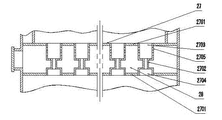 图中: 1-水套a,2-横水管a,3-入水口,4-水管,5-管路阀门,6-煤转可燃气体发生室,7-炉排,8-排渣室,9-除渣器,10-风机,11-风量调节阀,12-变频调速装置,13-加煤口,14-除渣口,15-排烟、可燃气体出口,16-排烟管道a,17-管道闸门,18-防爆器, 19-安全阀,20-可燃气体输送管,21-流量调节阀,22-止回阀,23-水套b,24-横水管b,25-出水口,26-可燃气体燃烧室,27-燃烧器,2701-上下支板,2702-燃烧喷筒,2703-上端喷口,2704-下端入口,2705-通孔,28-配风道,29-可燃气体缓冲室,30-除垢口,31-点火、观察及辅助配风口,32-自然配风口,33-清污炉口,34-排污阀,35-排烟出口,36-排烟管道b,37-四通管接,38-烟囱,39-发生炉炉体,40-燃烧炉炉体。