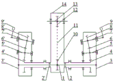 分插机构动力由插秧机链轮箱14内的主动链轮12经链条11传递到中心链轮10上,带动中心轴1转动,中心轴1带动左、右齿轮箱3'、3转动,左、右齿轮箱3'、3内,空套在中心轴1上与链轮箱14固定的左、右中心非圆锥齿轮4'、4与固定在左、右中间轴5'、5上的左、右中间非圆锥齿轮6'、6啮合,左、右中间非圆锥齿轮6'、6分别与固定在左、右行星轴7'、7上的行星非圆锥齿轮8'、8相啮合,其中左、右中间非圆锥齿轮6'、6与左、右中心非圆锥齿轮4'、4及行星非圆锥齿轮8'、8与中间非圆锥齿轮6'、6之间的轴交角分别为不等于90度的两个小角Φ和δ。当左、右行星非圆锥齿轮8'、8随左、右行星轴7'、7相对左、右齿轮箱3'、3转动时,带动左、右栽植臂9'、9转动,如图5、图6所示,由于左、右中间非圆锥齿轮6'、6与左、右中心非圆锥齿轮4'、4及行星非圆锥齿轮8'、8与中间非圆锥齿轮6、8之间的轴交角并不等于90度,为两个小角Φ和δ,使得左、右栽植臂9'、9的转动平面与齿轮箱3'、3的转动平面不是平行平面,成Φ+δ的夹角,形成如图7、图8所示的左、右栽植臂9'、9上的秧针的插秧静轨迹21,这样左、右栽植臂9'、9上的秧针在取秧后,其插秧点即秧针的插秧轨迹21与地面22的交点相对于取秧点即插秧轨迹21与秧门20的交点向左或向右偏移相应距离,使所插秧苗行距成宽窄变化。如右栽植臂9为例:右栽植臂9的转动使右拨叉17围绕固定的右凸轮16(固定在右齿轮箱3上)摆动,在取秧前右拨叉17经过右凸轮16的上升段而抬起,将右推秧杆18提高至最高点,同时压缩推秧弹簧19;在取秧到插秧前,右拨叉17处于右凸轮16的最高位置保持段;当秧爪到达插秧位置,右拨叉17转至右凸轮16缺口,右推秧弹簧19回位推动左、右推秧杆18向下快速运动,将秧苗推入土中。从而如图9、图10所示,顺利完成了水稻秧苗的取秧、插秧动作,实现水稻秧苗的机械化宽窄行移栽。