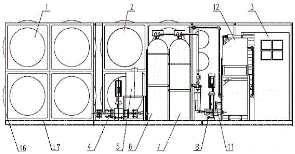 3Former water tank 1, middle front part is provided with ozone generator 15, chemicals dosing plant 5, active carbon filter 6 and quartz sand filtration device 7, postmedian is provided with 4m
