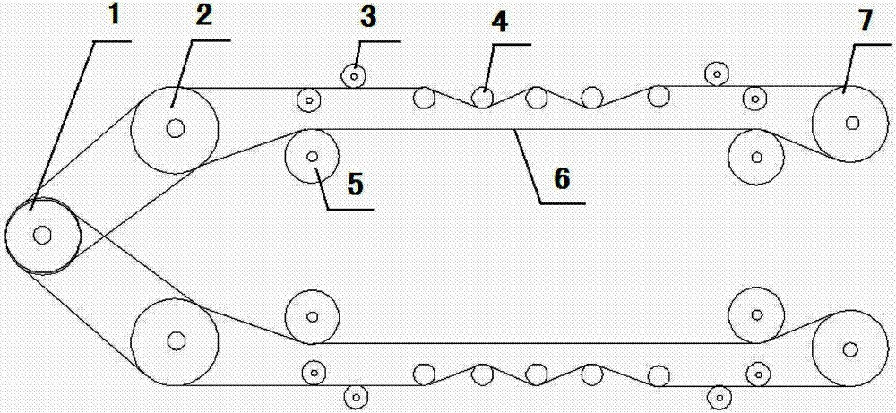 Among the figure: 1 is that spindle drive motors, 2 is that driving belt driving wheel, 3 is that driving belt regulating wheel, 4 is that spindle, 5 is that guide wheel, 6 is that apron belt, 7 is the driving belt driven pulley.