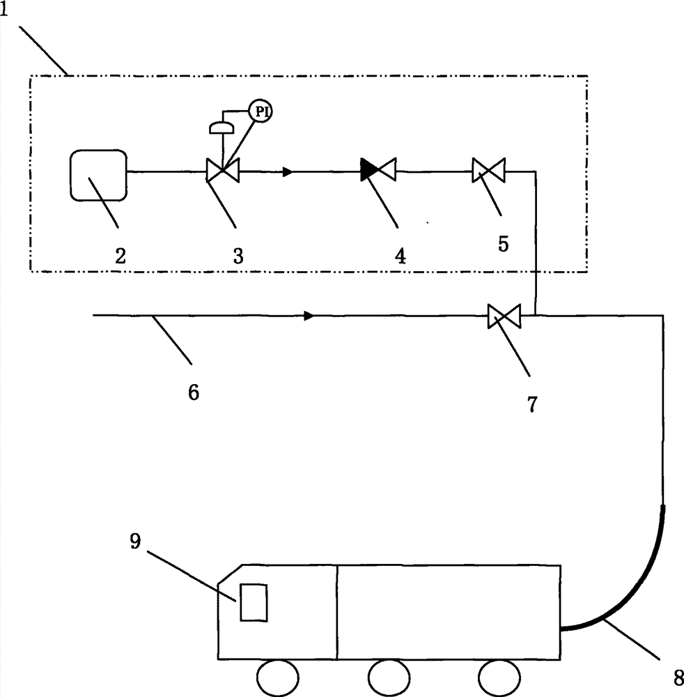 As shown in Figure 1, a kind of embodiment that cryogenic liquid tank lorry described in the utility model fills pipeline residual liquid recovering device is to fill recovering device 1 and be made up of mesohigh pressurized gas source of the gas 2, pressure regulator valve 3, one-way valve 4 and recovery valve 5;