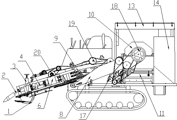 优选的是,所述夹持输送归集装置的前端设有挖掘装置和限深装置,所述挖掘装置包括扶禾器和挖掘铲;所述挖掘装置的数量为4组,所述4组挖掘装置分别设置在夹持链I、夹持链II、夹持链III和夹持链IV的前方;所述限深装置设于夹持输送A路和夹持输送B路之间的机架上。 Preferably, the front end of the clamping, conveying and collecting device is provided with an excavating device and a depth-limiting device, and the excavating device includes a grain lifter and an excavating shovel; the number of the excavating devices is 4 groups, and the 4 groups of excavating devices The devices are respectively arranged in front of the clamping chain I, the clamping chain II, the clamping chain III and the clamping chain IV; the depth limiting device is arranged on the frame between the clamping and conveying road A and the clamping and conveying road B .