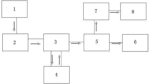 Parts, position and numbering among the figure: solar panels 1, light-operated circuit 2, super-charge super-discharge protective circuit 3, storage battery 4, constant-current drive circuit 5, led light source 6, body induction circuit 7, sensor port 8.