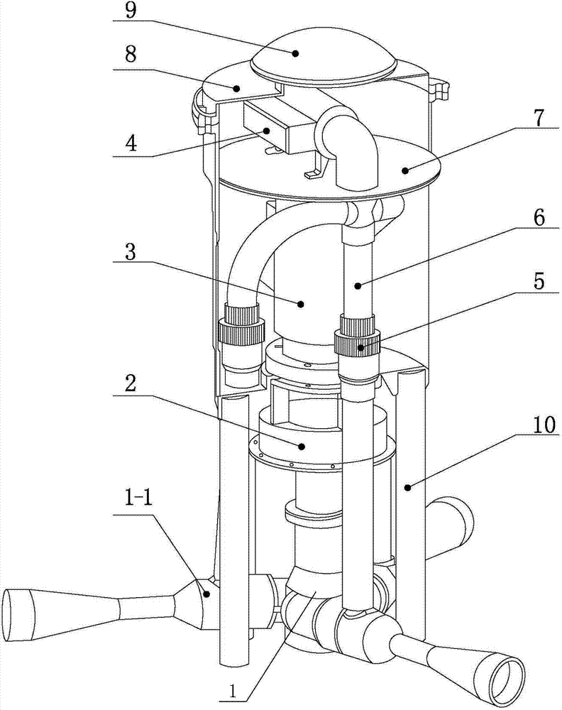 As shown in Figure 1, the oxygenating machine of ozone under water described in the utility model comprises hyperoxia ejector 1, water pump 2, drive-motor 3, ozonizer 4, keg float 8.Described keg float 8 plays buoyancy and stabilization, and keg float is shaped as circular or square.Be provided with in the described keg float 8 and separate dividing plate 7, described ozonizer 4 is arranged on and separates on the dividing plate 7, and ozonizer is the pipeline type structure, and air flows through from the ozonizer inner chamber, and the power supply electrion produces ozone.Air inlet port is arranged at keg float 8 tops, and air inlet port can be convenient to ozonizer for air admission and use.Described keg float 8 is equipped with rain cover 9 on air inlet port, rain cover 9 is used for preventing that rainwater from entering in the keg float.Described drive-motor 3 is arranged on the bottom of keg float 8, separates dividing plate 7 belows, and described water pump 2 is arranged on described motor 3 bottoms, and motor adopts vertical machine, connects water pump at the bottom of the motor shaft keg float, and motor shaft and bucket have an annular seal space at the end, charge of oil envelope sealing in the annular seal space.Water pump 2 upper ends were connected with the bucket end, and water pump shaft is connected with motor shaft, and the water pump lower end is connected with the hyperoxia ejector.Described hyperoxia ejector is arranged on described water pump 2 bottoms, and the bottom of keg float 8 also is provided with 3 ~ 6 feets 10, and feet 10 plays a supportive role, and prevents bucket 8 overturnings.Described hyperoxia ejector is provided with at least one spray gun 1 that is used for mixing water and ozone and sprays, the spray gun 1-1 quantity of described hyperoxia ejector is 1~6, according to the quantity of spray gun 1-1, spray gun 1-1 and water inlet pipe 16 are tangent at circumferential direction, and the axial angle between the adjacent spray gun is 30