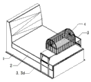 1.如图1、图1a、图1b、图2、图3所示,滑板式防倾倒款:带防倾倒滑板、可收折、可调节高度、几面两端有凸缘,包括:横跨在床面上的面板支架3.1b、面板3.1a,位于面板支架3.1b两端可调高度可收折的套管式可伸缩几脚3.2(其中包括外套管3.2a、内套管3.2b、连接外套管的上横梁3.2c、连接内套管的下横梁3.2d、高度固定弹簧凸头3.2e,如图1a所示)、连接在几脚下横梁3.2d下方的长度超出几面宽度的防倾倒滑板3.3(其中包括滑板支架3.3a、底部滑垫或滚轮3.3b)、连接几脚外套管3.2a及几面支架3.1b的铰接3.4、连接3.2a及3.1b的气压支撑杆3.5(如图1、图1b所示)、带装饰和阻挡功能的几端凸缘3.6。