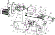 As depicted in figs. 1 and 2, the utility model comprises base 1, described base 1 one ends are provided with main spindle box fixture 2, the other end of base 1 is connected with fine grinding device, described fine grinding device comprises correct grinding motor 21, and the bistrique 7 that is fixed in correct grinding motor 21 output shaft ends, described bistrique 7 points to main spindle box fixture 2; Described main spindle box fixture 2 tops are provided with a plurality of installation screws (in the implementation case, main spindle box fixture 2 tops are evenly distributed with 8 screw is installed), and described installation screw is by the bolting anchor clamps, and described anchor clamps are fixed main spindle box 23; Described main spindle box fixture 2 is connected with base 1 top by cushion block 8, and vertically fixedly there is piston cylinder the bottom of described main spindle box fixture 2, and piston rod is fixed in cushion block 8; The other end top of described base 1 is provided with cushion cap 9, described cushion cap 9 upper surfaces are provided with turntable 3, described turntable 3 top movable are connected with vertical slide unit 4, and described vertical slide unit 4 top movable are connected with cross slide 5, and it is fixing that the upper surface of described slide plate 5 will finish grind motor 21 by bearing 6; Four jiaos of cushion cap 9 places are provided with bolt respectively, and turntable 3 bottoms are provided with the support plate 11 with cushion cap 9 couplings, and the Si Jiaochu of described support plate 11 is provided with bolt is complementary and turns to through hole 12; Described turntable 3 tops and vertical slide unit 4 bottom correspondences are provided with vertical chute 13 and the vertical slide rail 14 that is complementary, described turntable 3 longitudinally chute 13 directions is rotatably connected to longitudinal leadscrew 15, vertical pair of nut is fixedly arranged at described vertical slide unit 4 bottoms, and vertically slide unit 4 is in transmission connection by vertical pair of nut and longitudinal leadscrew 15; Described vertical slide unit 4 tops and cross slide 5 bottom correspondences are provided with horizontal concrete chute 17 and the horizontal slide rail 18 that is complementary, described vertical slide unit 4 is rotatably connected to horizontal leading screw 19 along horizontal concrete chute 17 directions, horizontal pair of nut is fixedly arranged at described cross slide 5 bottoms, and cross slide 5 is in transmission connection by horizontal pair of nut and horizontal leading screw 19; The end of described longitudinal leadscrew 15 and horizontal leading screw 19 is provided with drive unit, described drive unit is for rotating in handwheel 16 or the servomotor 20(the implementation case, the drive unit of longitudinal leadscrew 15 ends is for rotating handwheel 16, and laterally the drive unit of leading screw 19 ends is servomotor 20); Described bistrique 7 is fixed with the output shaft of correct grinding motor 21 by the set bistrique anchor clamps 22 of correct grinding motor 21 output shaft ends; The edge, bottom of base 1 evenly is provided with installing hole 10.