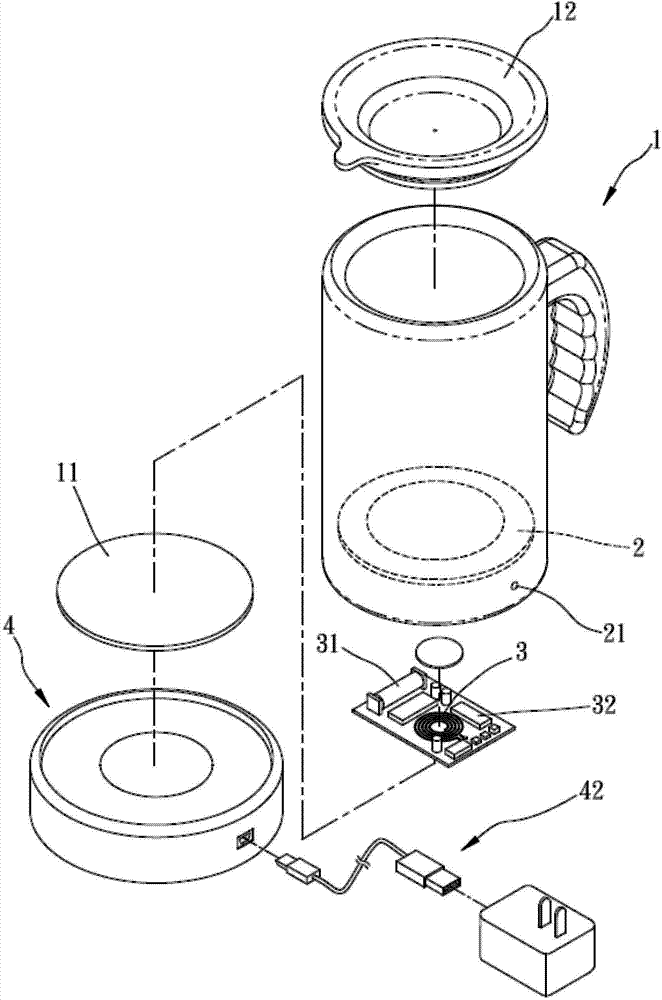 请参阅图1、图2及图3所示,本实用新型有关一种无线充电恒温保温杯的结构,其包括一杯体1、一无线充电接收电路3、一充电电池31、一加热及恒温控制电路32、一加热器2、一底座4及无线充电传送电路41,其中该杯体1底部设有加热器2,该加热器2的加热及温度控制由设于杯体1底部空间的加热及恒温控制电路32作控制,进而控制加热器2的加热温度及保持恒温的功效,于杯体1底部空间,另设有无线充电接收电路3及充电电池31,于杯体1顶部具有一杯盖12,最底部则组设有一底盖11,并于底座4内设有一无线充电传送电路41,当底座4插上一般家用电源或USB电源42使底座4内的无线充电传送电路41开始工作,将杯体1置于底座4上方后,设于杯体1底部空间的无线充电接收电路3则与底座4的无线充电传送电路41间产生无线电力传输,进而可对充电电池31进行充电,并供电给加热及恒温控制电路32及加热器2,进而达对杯体1加温或保持恒温的目的,另于杯体1上设有多色光LED21,而以不同色光显示杯体1于加热或恒温保温的状态,于杯体1内底部设有一温度感知器22,由温度感知器22感测杯体1内液体的温度达所设定的温度时及由加热及恒温控制电路32控制使加热器2电源中断停止加热,或使加热器2对杯体1产生恒温加热。Please refer to Fig. 1, Fig. 2 and Fig. 3, the utility model relates to a structure of a wireless charging constant temperature thermos cup, which includes a cup body 1, a wireless
