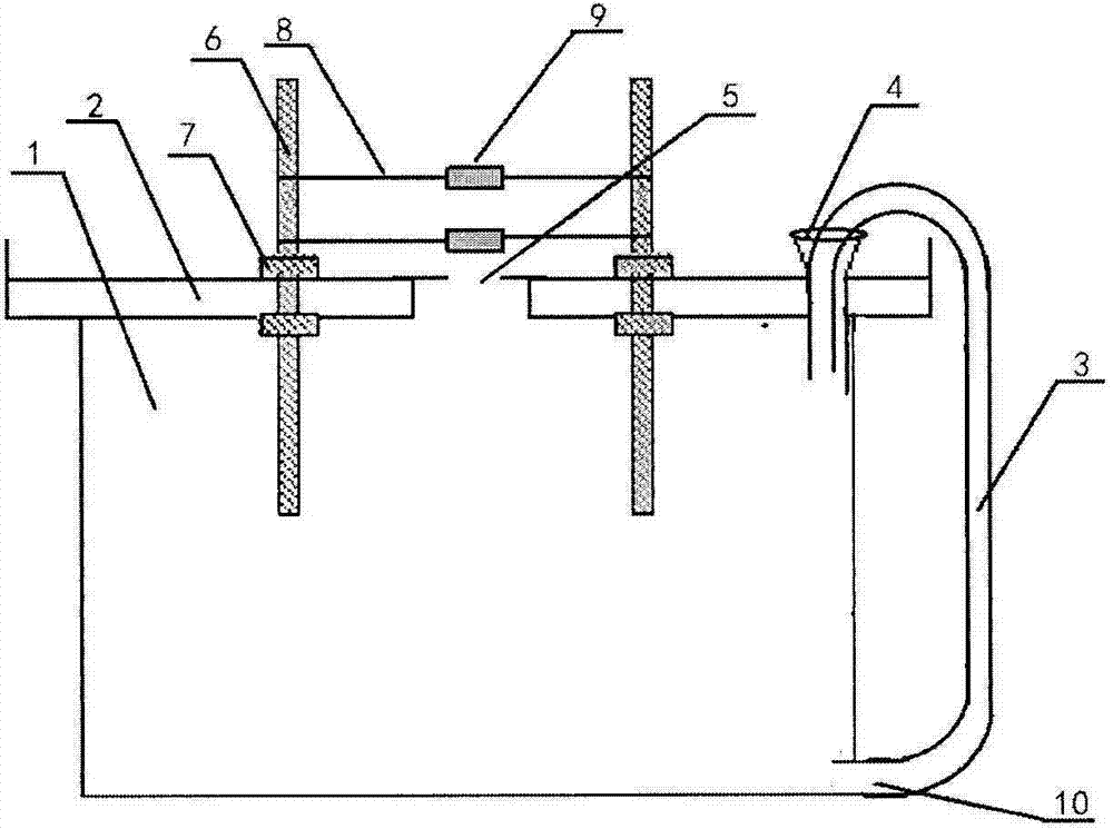 图中:1、贮液箱,2、定植板,3、软管,4、进水口,5、烟苗植入孔,6、支撑杆,7、螺母,8、橡皮筋,9、软质材料,10、出水口。 In the figure: 1. liquid storage tank, 2. planting plate, 3. hose, 4. water inlet, 5. tobacco seedling implantation hole, 6. support rod, 7. nut, 8. rubber band, 9. soft Material, 10, water outlet.