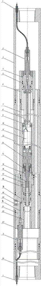 As shown in Figure 1, this φ 95mm ground direct controlled type production mandrel, comprise seal head 3, the positive and negative box cupling 12 of top connection, body 21, the positive and negative box cupling 23 of lower contact, lower contact 24, positive and negative box cupling 12 upper and lower sides of described top connection connect respectively the upper end of seal head 3 and body 21, and positive and negative box cupling 23 upper and lower sides of lower contact connect respectively body 21 lower ends and lower contact 24; In described seal head 3 openends and lower contact 24, have cable passage, lower cable passage, in upper cable passage, lower cable passage, primary seal 1 is housed respectively; Body 21 inner chamber tops be threaded successively resistance to compression outer cover II 7 and resistance to compression outer cover I 6; Resistance to compression outer cover I 6 inner chamber upper port are fixed with seal plug 4, and 4 of resistance to compression outer cover I 6 and seal plugs are equipped with sealing ring 5, and seal plug 4 tops connect secondary seal 2; Body 21 cavitys vertically have cable passage h, and body 21 middle parts radially have through hole by outer wall to cable passage h, and through hole is built-in with and compresses plug screw A20 and pressure sensor 19, compresses plug screw A20 pressure sensor 19 is fixed on to test pressure on body 21; Cable passage h bottom is connected with secondary seal 2; On the positive and negative box cupling 12 of body 21 and top connection, have the passageway bridge 14 of UNICOM, make liquid in lower floor's oil pipe from moving to upper stream under the effect of oil pumper passageway bridge 14; Resistance to compression outer cover I 6, resistance to compression outer cover II 7 and body 21 inner chambers are connected with seal plug 4, circuit unit 8, circuit board support 9, motor cover 10, motor combination 11, coupling assembly 13, dynamic sealing assembly 15, power transmission shaft 16, upper piston cylinder 17, piston 18, lower piston cylinder 22 from top to bottom in turn; Wherein circuit unit 8 is arranged on circuit board support 9, control the regular rotation of motor combination 11, the outer motor cover 10 that is equipped with of motor combination 11, motor combination 11 bottoms connect coupling assembly 13 and power transmission shaft 16, motor combination 11 drives power transmission shaft 16 and rotates under the effect of coupling assembly 13, power transmission shaft 16 outsides of coupling assembly 13 bottoms are equipped with dynamic sealing assembly 15, have dynamic sealing assembly 15 to guarantee the sealing of motor combination 11 upper ends between power transmission shaft 16 and coupling assembly 13; The power transmission shaft 16 lower ends piston 18 that is threaded, piston 18 outsides are equipped with upper piston cylinder 17 and lower piston cylinder 22; Piston 18 and power transmission shaft 16 are delivered in upper piston cylinder 17 and 22, lower piston cylinder is done rectilinear motion through screw thread, realize opening, close and fixing aperture of stratum liquid measure switch; Cable is introduced circuit unit 8 through primary seal 1, secondary seal 2, seal plug 4, cable is from being divided into two parts on circuit unit 8 after compressing stifled 9, a part is connected to motor combination 11, another part is divided into two parts after going downwards to cable passage h, part cable is connected to pressure sensor 19, and another part enters into the cable-passing packer of next stage along the descending primary seal 1 connected successively in secondary seal 2, lower cable passage of cable passage h.