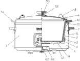 Reference numeral wherein is: metal hanger A, silicone band B, long handle angles F, gap H, insulated space K, machine screws L, flat gas ket L1, silicone gasket L2, high temperature lead S, support glue pin T, shell body 1, pot shell 11, window 11a is installed, cooker-bottom lid 12, fairlead 12a, power pack mouth 12b, the outer courage 2 of aluminium, turning over folded edges 21, Electrothermal ring 3, breach 3a expands with heat and contract with cold, interior pottery courage 4, handle 4a, abduction is along limit 41, glass cover 5, safety discharging air hole 5a, sealing ring 51, platen cover 52, lid handle 53, PCB computer display and operation plate 61, super large LCDs 61a, power panel 62, PCB inner cover 63, face shield 64, face note 65, electroplated decoration circle 66, side handle 7, power pack 8, power supply lid 81, mica heat shield 82, power outlet 9.