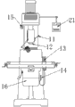 铣床在进行复杂零件加工时,有数控屏的铣床的结构如图1和2所示,主要包括电机(1)、立柱(2)、铣头(4)、工作台(6)、主轴(12)、升降台(16)和数控屏(21),其中,电机(1)设在有数控屏的铣床顶部,安装在减速机箱(22)上,在减速机箱(22)的下端设有主轴(12),在主轴(12)的外侧设有套筒进给手轮 (11),在套筒进给手轮 (11)上设有高低转速开关(3),铣头(4)与主轴(12)相连接,高低转速开关(3)用于控制铣头(4)的转速,为了便于有充足的光线查看加工部件,在铣头(4)的支臂(17)上设有伸出的照明灯(5),在支臂(17)的下端与立柱(2)相连,立柱(2)通过垂直导轨(18)与升降台(16)相连接。