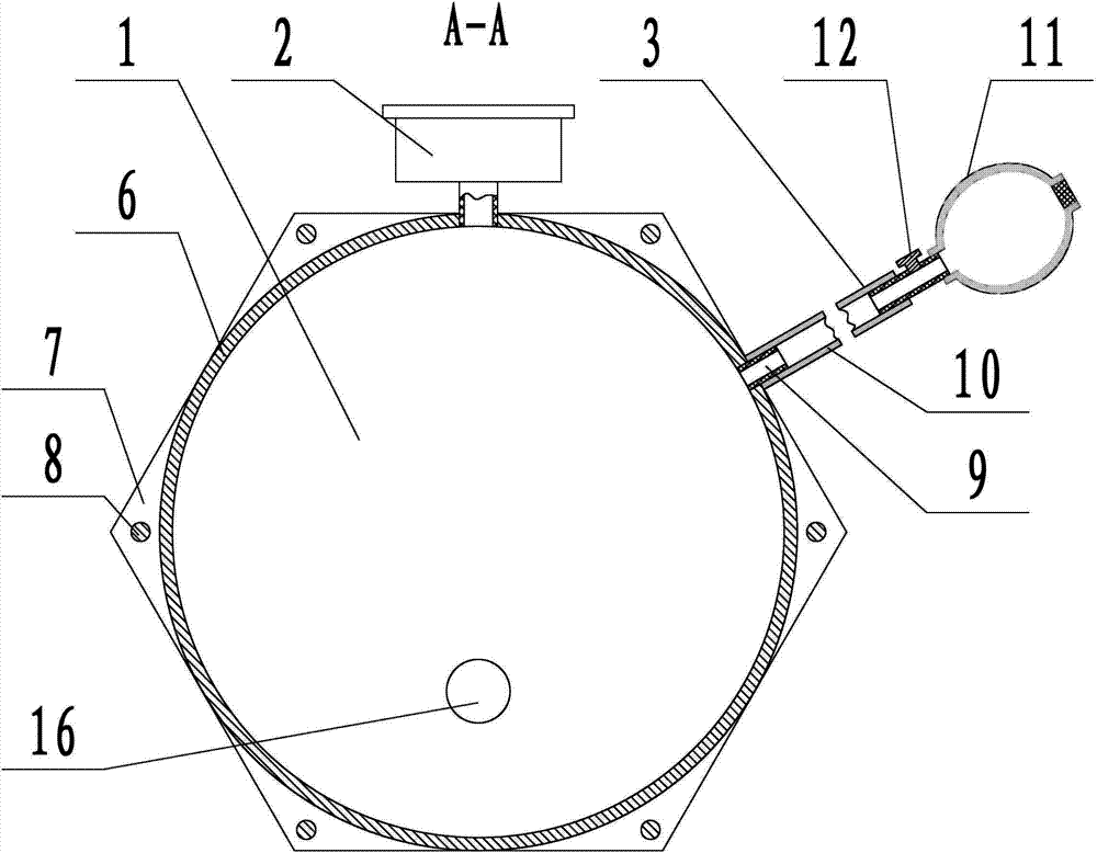 实施例:一种灯具透气防水膜检测装置(参见附图1、附图2),包括储液罐1、连接在储液罐1上的气压表2、连接在储液罐1上的增压器3,储液罐1包括圆筒形的罐体6,罐体6的两端均连接有正六边形的端盖7,两端盖7和罐体6密封连接构成储液罐1。罐体6两端的两个端盖7对称设置,两端盖7之间均布连接有六根连接杆8,连接杆8设置在端盖7的转角位置,连接杆8一端插接在一个端盖7上,另一端穿过另一个端盖7并通过螺母紧固连接。可以通过连接杆8调节两端盖7之间的距离,从而调节端盖7和罐体6连接的密封性能,也增加了端盖7和罐体6的连接强度,增加连接的可靠性。增压器3包括连接头9、充气软管10、冲气囊11,连接头9呈两端导通的圆筒形并连接在储液罐1上,充气软管10一端连接在连接头9上,另一端连接在冲气囊11上,冲气囊11和储液罐1连通,冲气囊11和充气软管10的连接位置设有用于封闭充气软管的调节阀12。通过按压冲气囊11对储液罐1进行增压,当储液罐1内达到需要的压力时停止按压冲气囊11并转动调节阀12封闭充气软管10,使充气软管10和冲气囊11隔离,储液罐1内的气压就不会通过冲气囊11向外泄漏。储液罐1上设有检测孔4,检测孔4上连接有用于安装待测膜的检测头5,储液罐1内设有检测液,检测液为纯净水。检测头5呈两级台阶轴结构,检测头5中间沿轴线方向设有两端贯通的连通孔13,检测孔4设置在端盖7上,检测头5和端盖7外表面之间设有密封圈14,密封圈14紧密连接在检测头5和端盖7之间,增加密封性能。检测头5的小径端连接有用于安装待测膜16的橡胶套15,橡胶套15设置在储液罐1内。